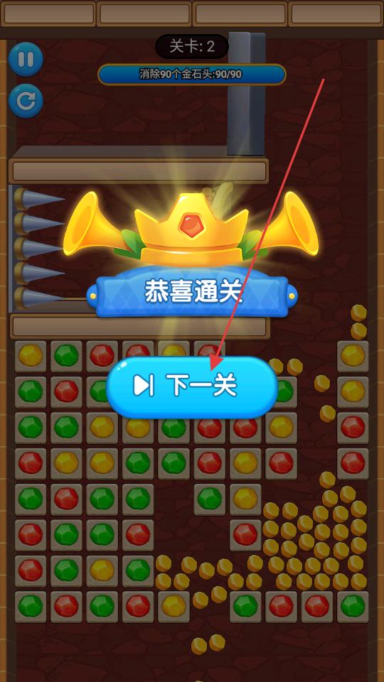 4、當成功消除足夠數量的金石頭,游戲會顯示恭喜通關界面,此時點擊下一關按鈕,就能進入下一個關卡,繼續進行寶石消除和金石頭收集的任務。