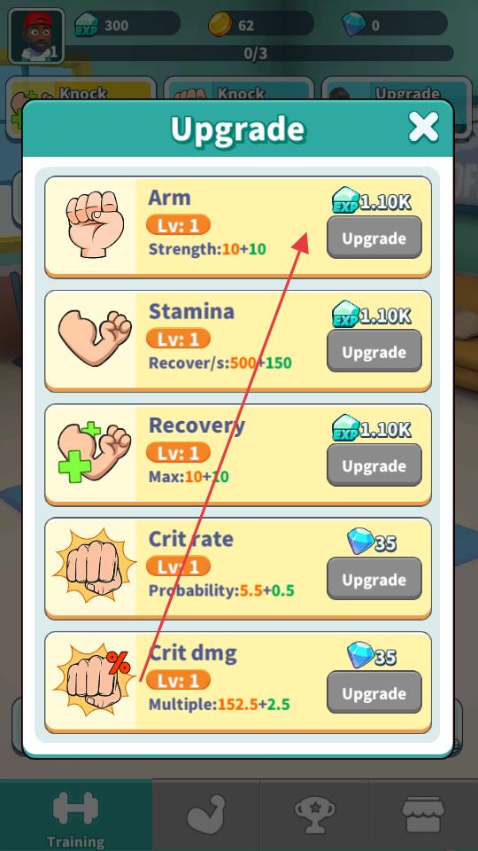 4、進入升級界面后,能看到手臂、耐力等不同屬性的升級選項,根據需求花費對應的資源點擊升級按鈕,可提升角色的力量、恢復等能力,讓訓練變得更高效。