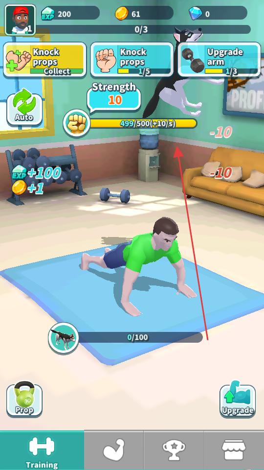 1、進入游戲后在訓練界面里,角色會進行俯臥撐等訓練動作,身邊的寵物會隨之互動,此時可觀察上方的力量值等數據,讓訓練正常開展,逐步積累經驗和金幣。