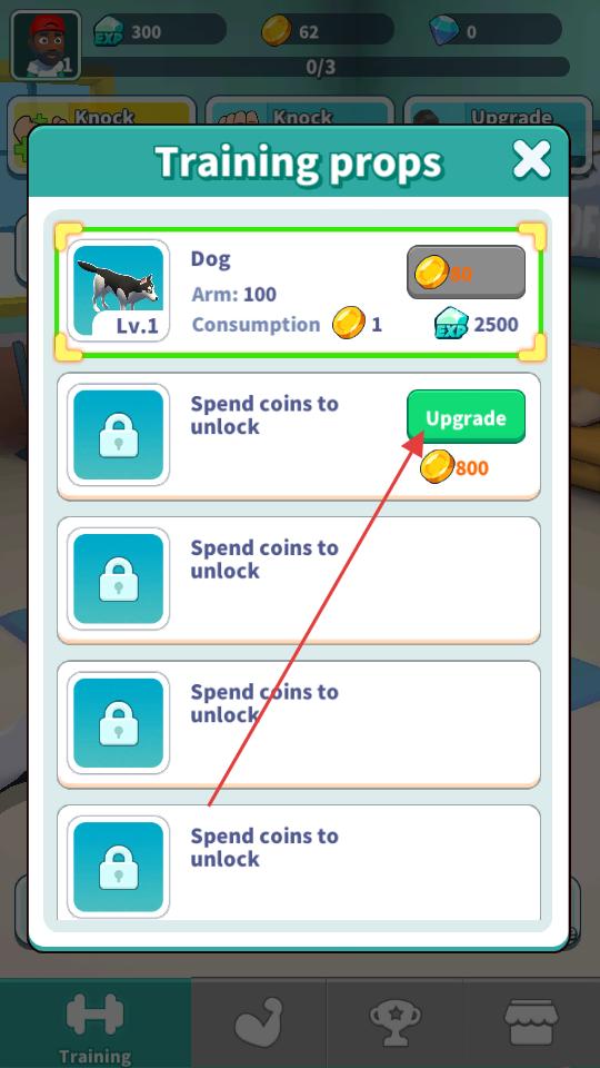 3、點擊道具相關按鈕,進入訓練道具界面,能看到當前寵物的屬性,花費金幣點擊升級按鈕,可提升寵物的能力,還能解鎖其他被鎖定的道具,豐富訓練時的互動元素。
