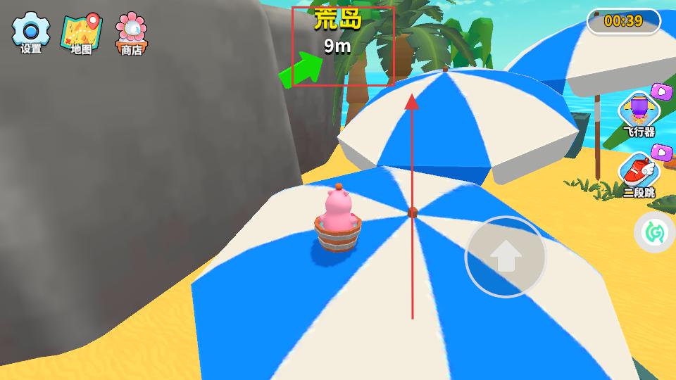 2、繼續操控角色前進,穿過藍白相間的遮陽傘區域,沿著綠色箭頭指示方向朝荒島移動,留意上方顯示的距荒島數值,了解前進進度。