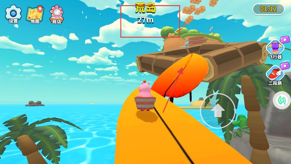 1、進入游戲后操控粉色角色在木板道路上前進,點擊右側向上箭頭按鈕,讓角色朝荒島方向移動,躲避木桶等障礙物,逐步靠近目標。
