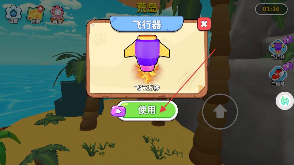 4、當需要快速前進時,點擊右側飛行器圖標,在彈出的飛行器界面中點擊使用按鈕,角色將使用飛行器飛行15秒,更高效朝荒島前進。