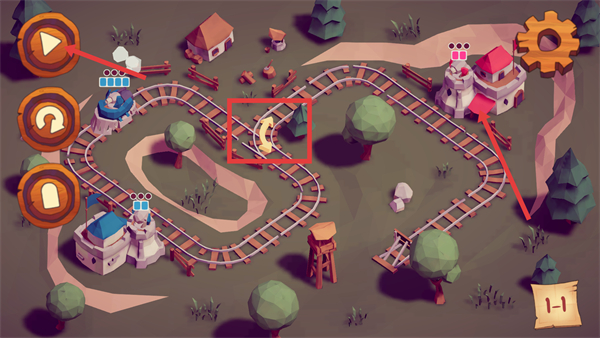 3、來到關卡場景中,點擊帶有箭頭的軌道節點調整軌道方向,確保列車能順利通行,然后點擊左上角播放按鈕啟動列車。