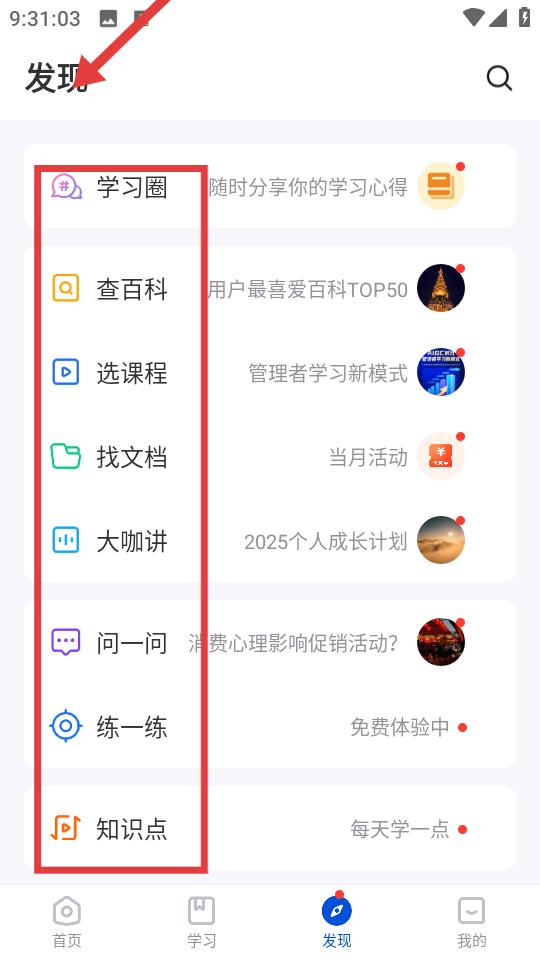 3、進入發現板塊左側陳列學習圈、查百科、選課程等功能入口,覆蓋知識查詢、課程選擇、交流分享等需求,為管理者打造多元學習場景。