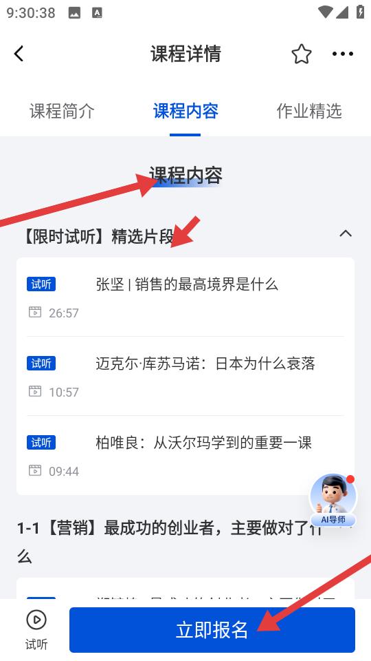 2、進入課程詳情頁切換課程內容標簽,查看限時試聽的精選片段,如銷售境界、日本經濟等課程,點擊底部立即報名即可參與系統學習。