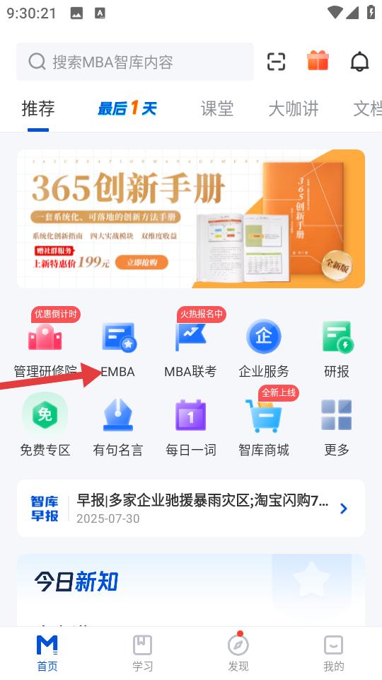 1、進入MBA智庫手機版首頁,頂部搜索欄便查找內容,推薦區展示365創新手冊等資源,點擊管理研修院圖標,可進入專業管理課程板塊。