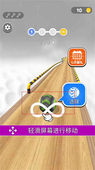 1、在游戲主界面然后進入關卡后,根據提示輕滑屏幕,操控球球在跑道上移動,躲避障礙物并沿著正確的路徑前進。
