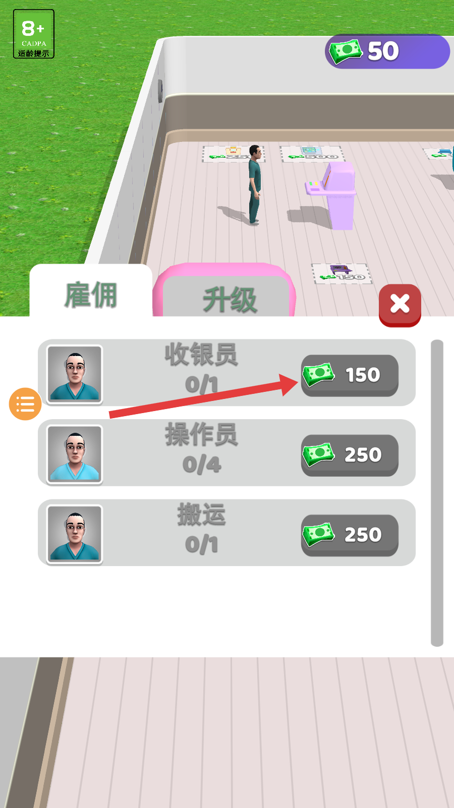 4、積累足夠資金后,可進入雇傭界面,花費相應金額雇傭收銀員、操作員、搬運工等不同崗位人員,助力醫院運營。