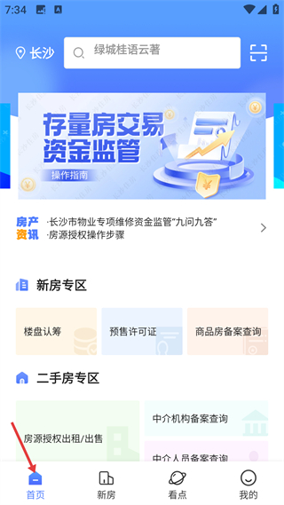 1、首頁聚合新房、二手房專區入口,含房產資訊與資金監管指南,定位長沙區域,是房產服務的綜合導航頁。