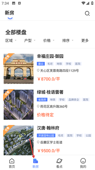 2、新房界面展示長沙在售樓盤列表,支持區域、戶型等篩選,呈現樓盤價格、位置等信息,是新房房源展示頁。