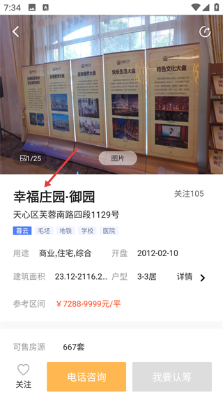 3、樓盤詳情界面呈現幸福莊園·御園等信息,含位置、價格、戶型,支持電話咨詢與認籌,是樓盤詳情頁面。