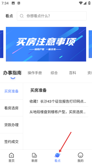 4、看點界面提供買房注意事項等資訊,設辦事指南分類,是購房相關知識與指引的集中展示頁。