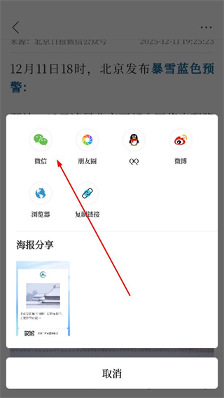 4、在分享界面中選擇微信選項即可將這篇暴雪預警資訊分享給微信中的聯系人。