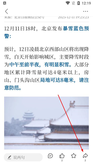 3、在資訊詳情頁閱讀預警內容,找到頁面底部的分享按鈕,點擊彈出分享選項界面。