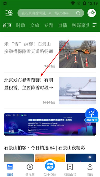 2、在首頁瀏覽資訊列表選擇北京發布暴雪預警相關,點擊進入該資訊的詳情頁面。