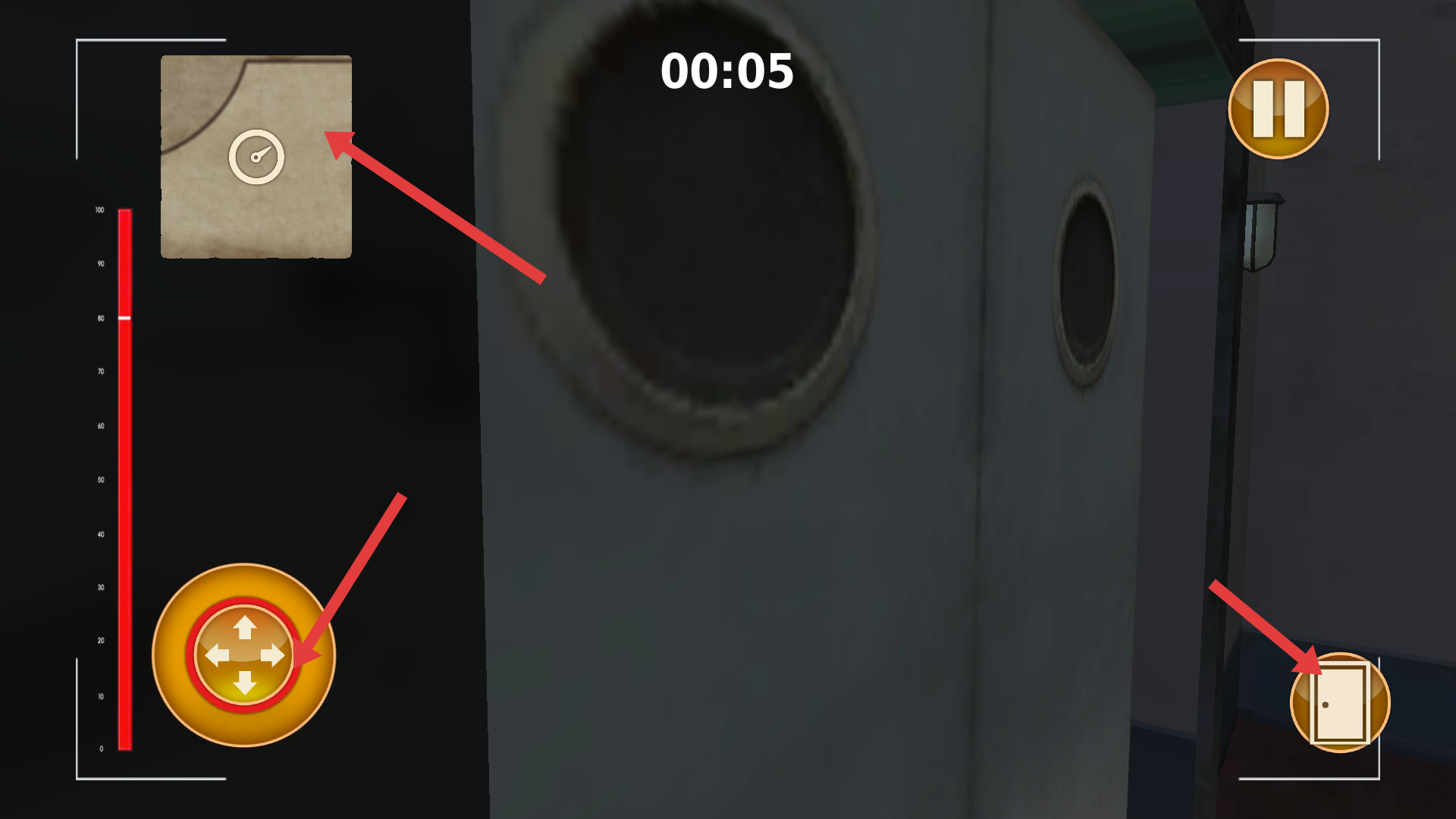 3、游戲中左側有移動控制按鈕,可操控角色移動,還有地圖指引方向,右側靠近物體會有互動鍵,例如出現門的按鈕,點擊可進行開門等操作。