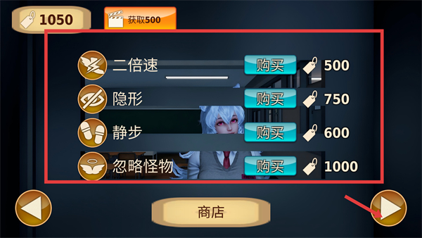 2、在商店界面有二倍速、隱形、靜步、忽略怪物等道具,可根據需求花費對應的貨幣購買道具,助力玩家游戲進程。