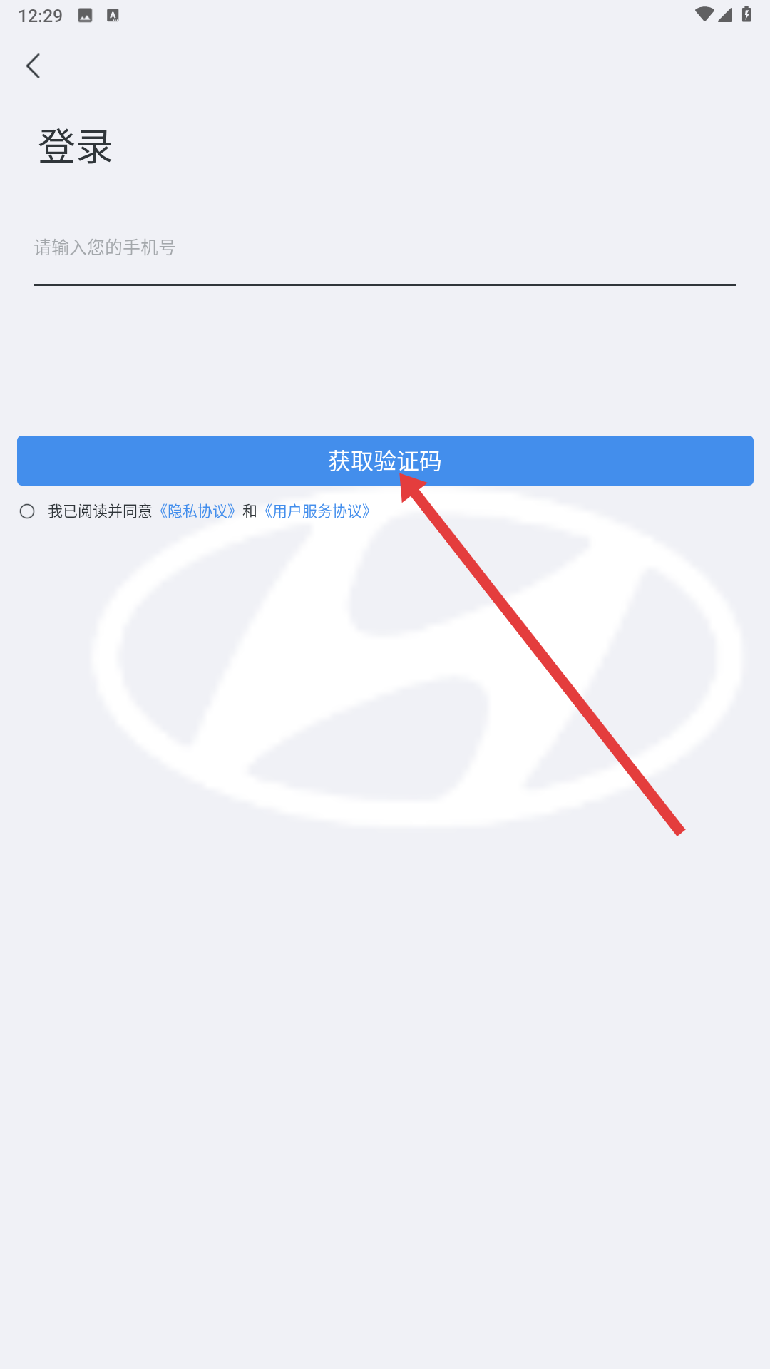 3、登錄界面輸入手機號,勾選同意隱私協議和用戶服務協議后,點擊獲取驗證碼。