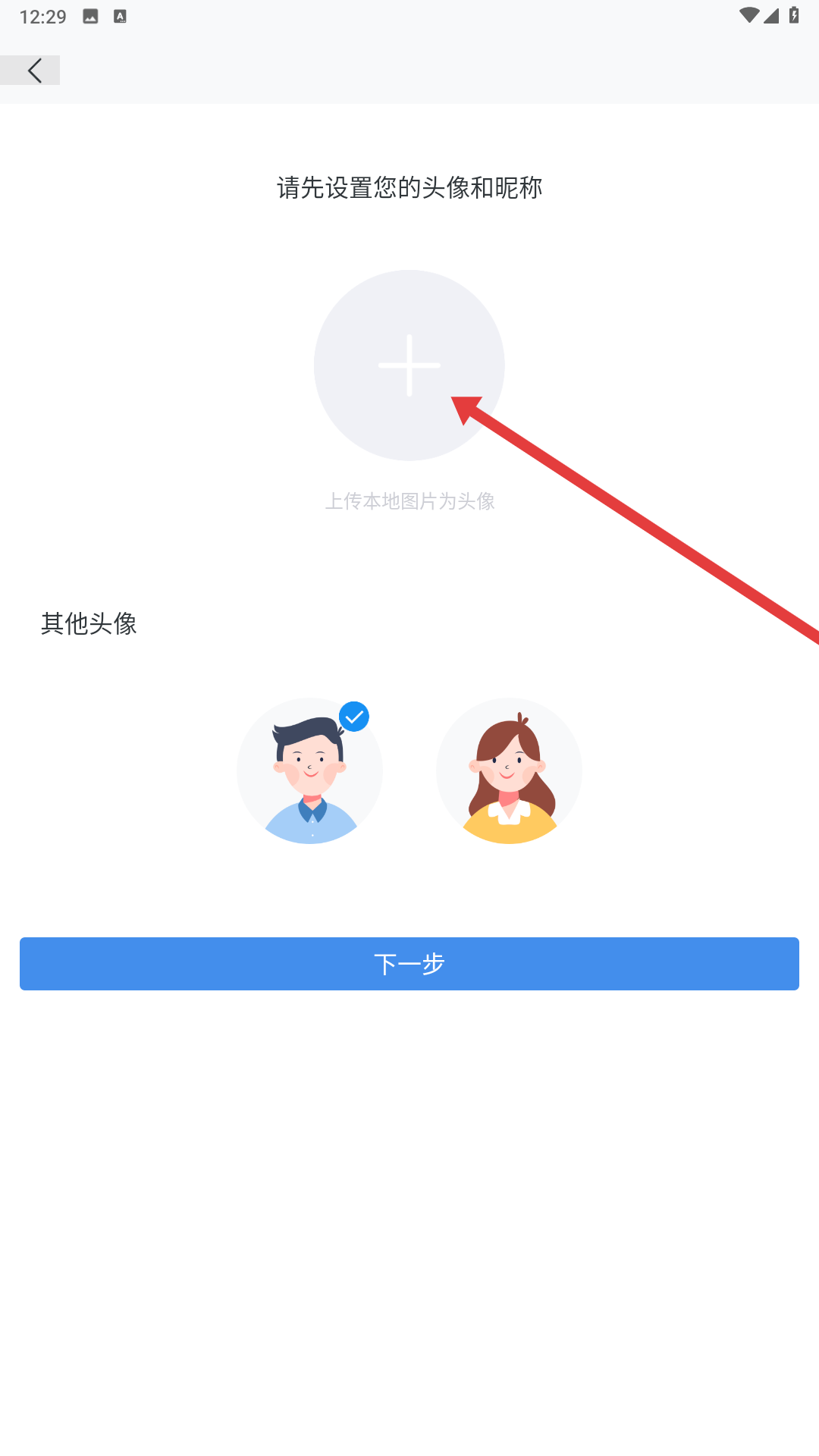 4、輸入驗證碼完成登錄后,可設置頭像和昵稱,如上傳本地圖片或選擇系統提供的頭像,設置完成后點擊下一步,完善個人信息。
