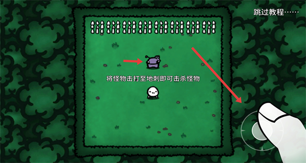 2、教程關通過虛擬搖桿操控角色,緊盯紫色怪物借撞擊將其推向頂部地刺,掌握推怪入陷阱核心機制,完成首關擊殺熟悉基礎操作。