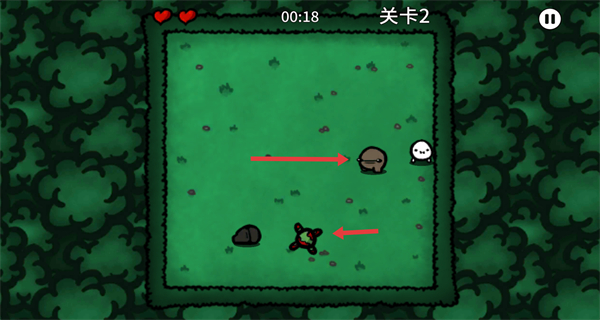 3、關卡2觀察場景,利用石頭阻攔怪物優先避讓紅色危險目標,規劃路線將棕色怪物推至陷阱,借助場景道具提升生存與擊殺效率,把控血量。