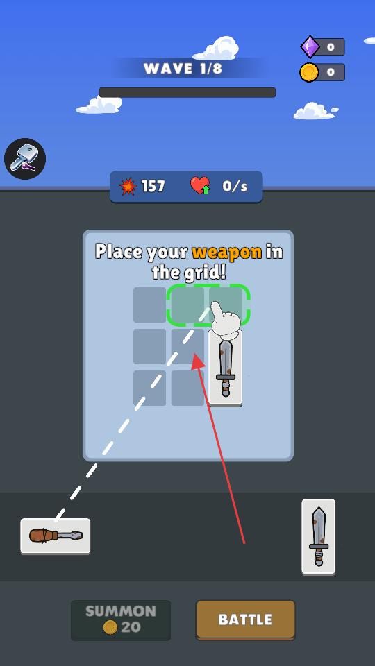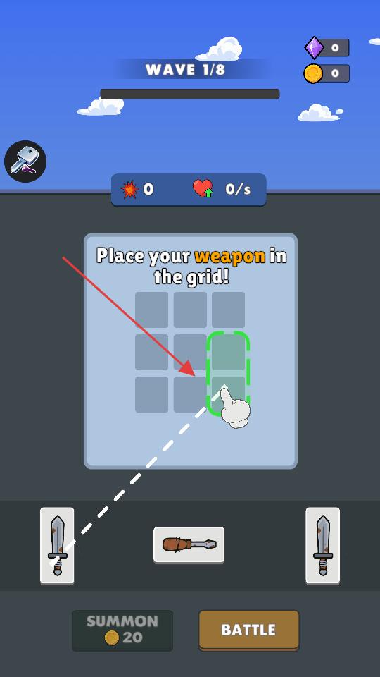 1、進入游戲后看到網格區域與下方武器,按照提示把武器拖到網格內的綠色框位置,完成首次武器放置,此時上方攻擊數值開始變動。