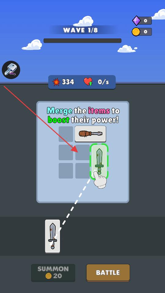 3、當網格內有可合成的武器時,按照提示把相同類型的武器拖到一起,進行合并,合并后武器威力增強,攻擊數值大幅增加。
