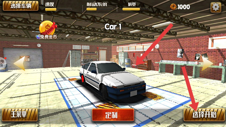 2、在車庫界面,可選擇車輛,還能定制速度、制動系統、硝基等屬性,完成設置后點擊選擇開始。