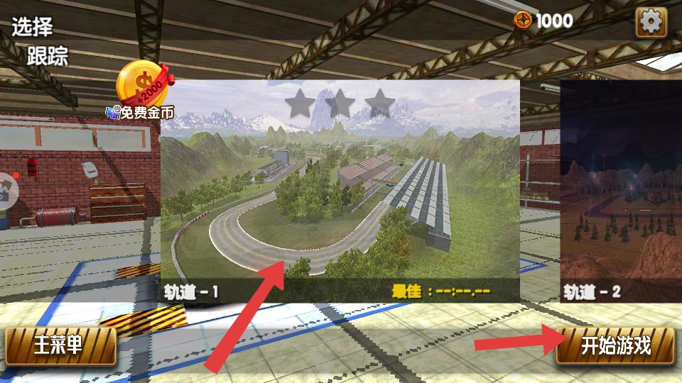 3、選擇軌道1,點擊開始游戲,進入該賽道,準備駕駛車輛在蜿蜒山路賽道上競速。
