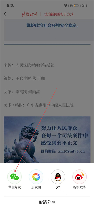 4、分享按鈕在彈出的選項中選擇微信好友等渠道,將該法治資訊分享出去完成分享。