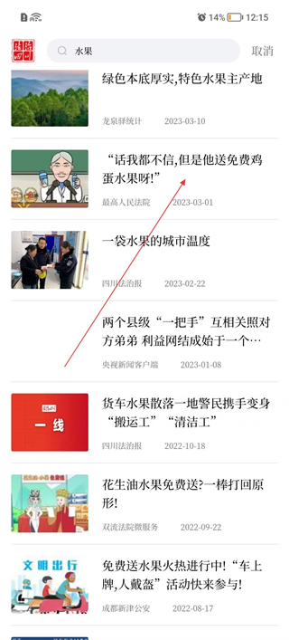 2、登錄后進入搜索頁面在搜索框輸入關鍵詞,瀏覽展示的資訊列表選擇一篇感興趣的內容,比如免費雞蛋水果相關資訊,點擊進入詳情頁。