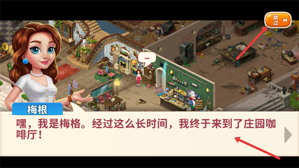 4、會有劇情對話,介紹角色來到莊園咖啡廳的情況,可點擊跳過快速結束對話,繼續游戲。