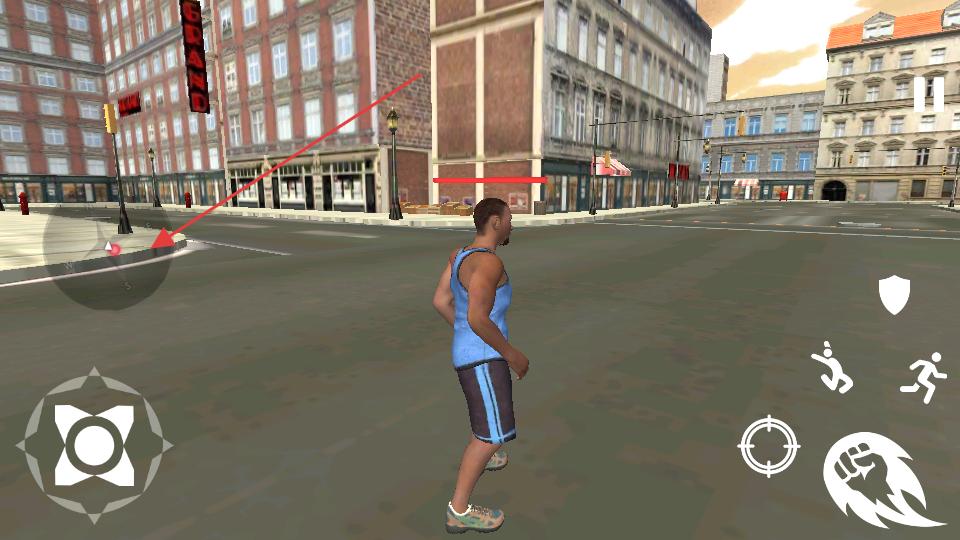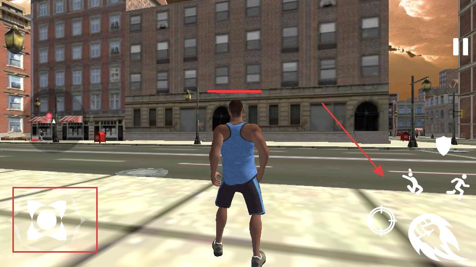 3、進入關卡1后借助左側的方向按鍵,操控人物在城市街道中移動,開始探索街道周邊的建筑與環境,熟悉游戲場景。
