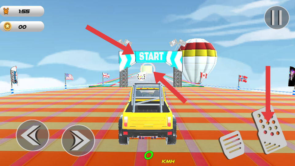 1、進入游戲,操控黃顏色卡車,利用右側按鍵控制加速,朝著標有START的起點區域前進,準備開啟競速挑戰。
