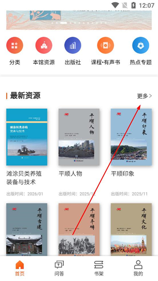2、登錄后進入首頁可通過分類、本館資源等板塊瀏覽內容,點擊最新資源后的更多按鈕,查看更多資源列表,拓展資源選擇范圍。