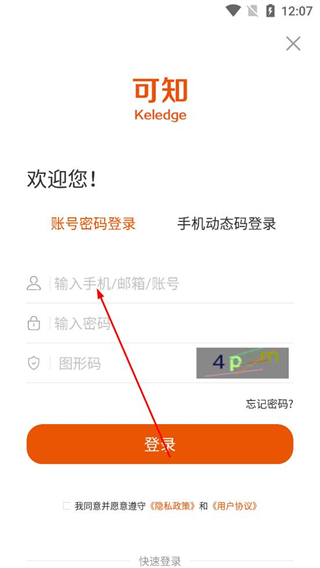 1、打開可知軟件,進入登錄頁面,選擇賬號密碼登錄,輸入手機或賬號、密碼及圖形碼,勾選相關協議后點擊登錄,完成賬號登錄。