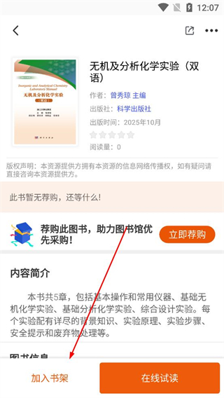 4、進入書籍詳情頁查看作者、出版社等信息,點擊加入書架可保存書籍,也可點擊在線試讀,體驗書籍內容。