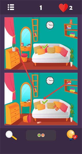 2、第一關基礎找茬觀察上下圖差異,點擊顏色如物品增減抱枕變化盆栽消失處,通過綠色對勾標記已發現差異。