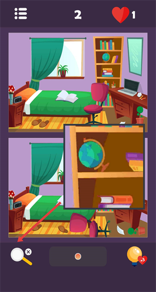 4、細節處理遇細微差異時,點擊左下角放大鏡放大區域聚焦物品位置如地球儀與書籍擺放或形狀變化,限時內完成找茬。