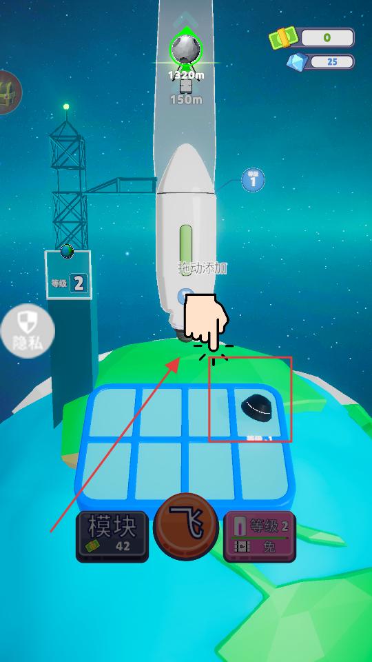 2、購買模塊后將模塊從下方的格子里拖動到火箭上,完成模塊的添加,這樣火箭就能獲得對應的功能,提升飛行或收集的能力。