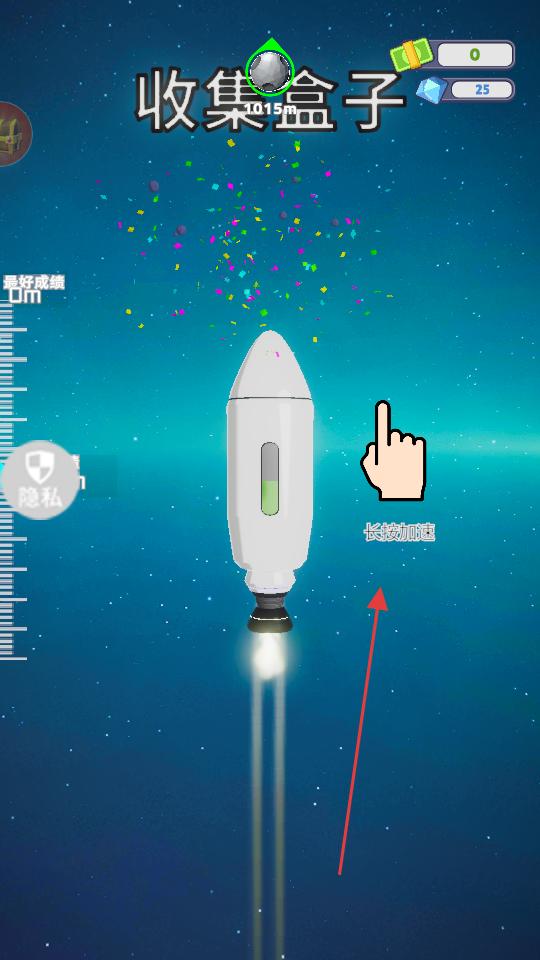 4、火箭飛行過程中看到長按加速的提示時,長按屏幕讓火箭加速,這樣能更快地收集空中的盒子,同時也能提升火箭的飛行高度。