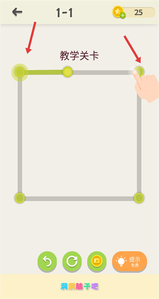 2、1-1為教學關卡,跟隨指引從左側綠點起筆,沿邊線依次連接節點按順序繪制正方形,通過該關掌握一筆畫的基本操作方法與流程。