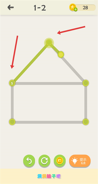 4、面對1-2房屋形狀關卡,先觀察圖形結構,從標有S的綠點出發先繪制屋頂斜線,再連接其余節點嘗試一筆連貫完成房屋圖案。