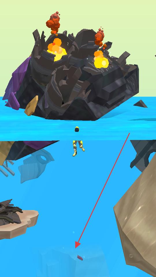 1、進入游戲后控制角色在水下朝著有廢墟的區域移動,此時能看到水面上方的破損結構,角色可逐漸下潛,探索水下的場景,尋找可收集的物品。