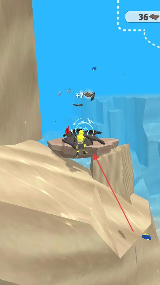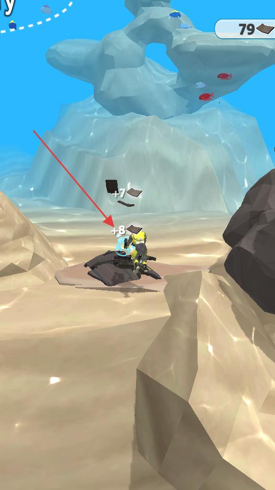 4、來到水下的沙地區域后繼續讓角色靠近散落的物品,進行收集每次收集都會有數字提示獲得的數量,持續收集來獲取更多資源。