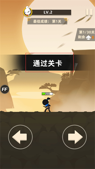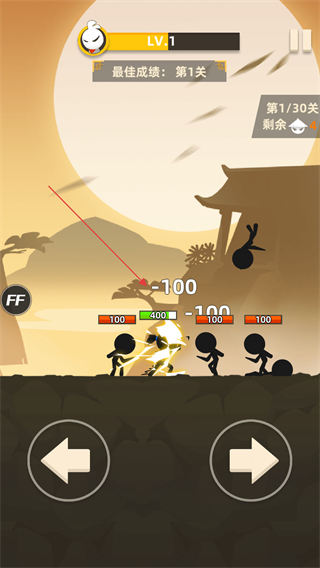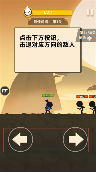 1、進入游戲關卡后,根據提示點擊屏幕下方左右兩個按鈕,操控黑色功夫火柴人角色擊退對應方向的敵人。