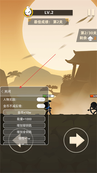 4、玩家可以點擊游戲中的MOD菜單按鈕,打開內置菜單可以選擇開啟人物無敵,讓角色在戰斗中不會受到傷害。