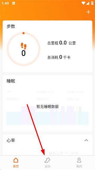 1、進入首頁界面可看到步數睡眠心率等數據模塊,當前步數總里程等數據顯示為0,底部設有運動按鈕,點擊該按鈕可進入對應的運動操作界面。