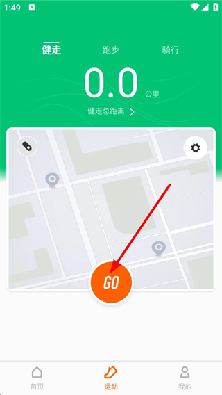 2、進入運動界面后能看到健走跑步騎行三類選項,界面展示健走總距離信息,地圖區域下方的GO按鈕,點擊后即可啟動健走的數據記錄進程。